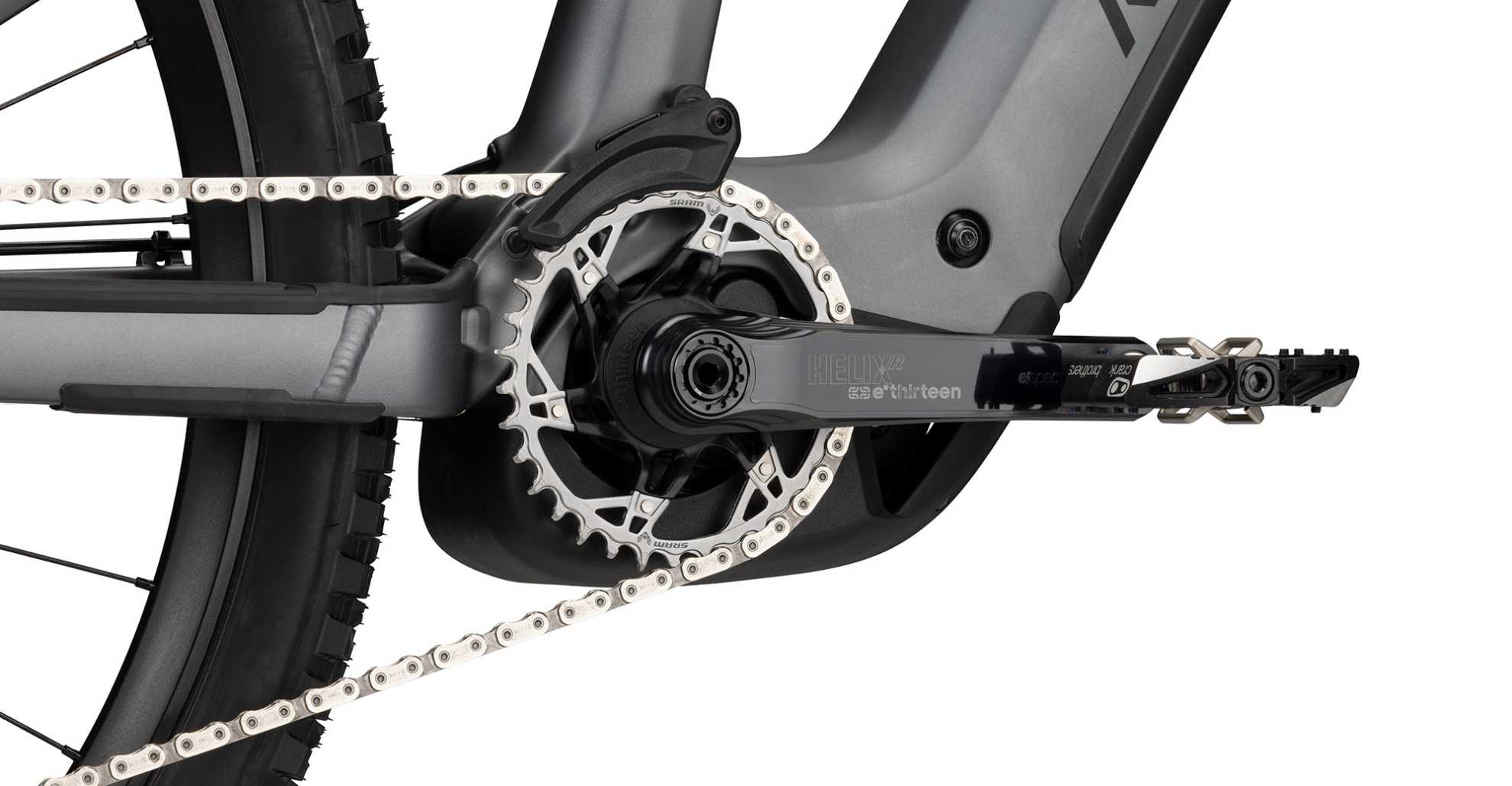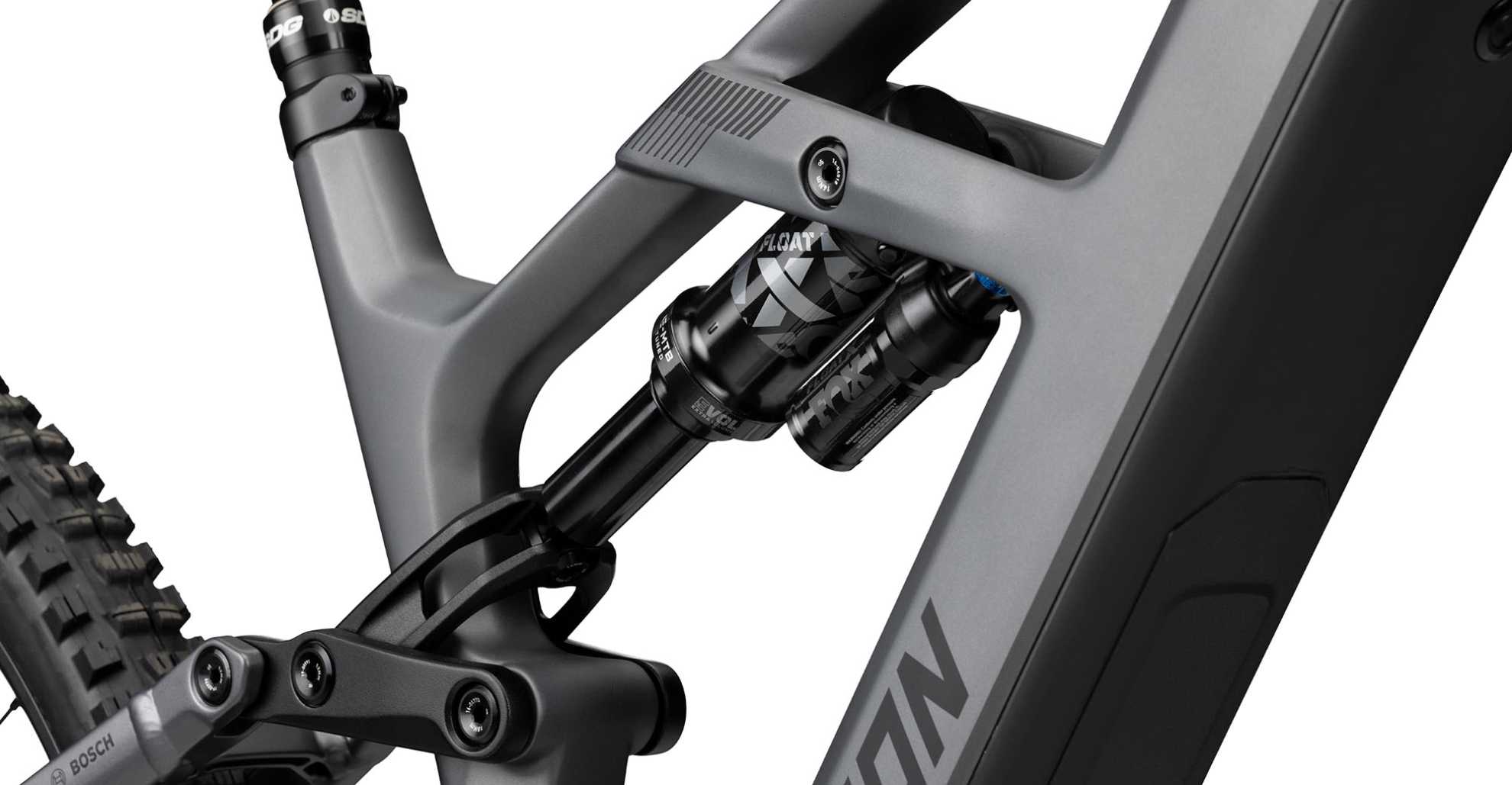 Charakterystyczna konstrukcja typu „wing design” łączy rurę dolną z górną, zwiększając sztywność ramy i precyzję prowadzenia, a jednocześnie integruje mocowanie tylnego amortyzatora w standardzie Trunnion. Rama wyposażona jest również w wewnętrzne prowadzenie przewodów przez stery z blokadą skrętu, hak przerzutki UDH oraz zintegrowany czujnik prędkości, co zapewnia maksymalnie schludny wygląd, wysoką niezawodność i łatwość serwisowania.